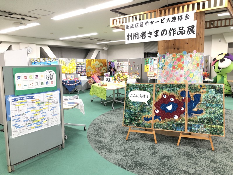 今年も東成区役所の1階・ふれ愛パンジーで、東成区通所サービス連絡会「利用者さまの作品展」が開催されました。